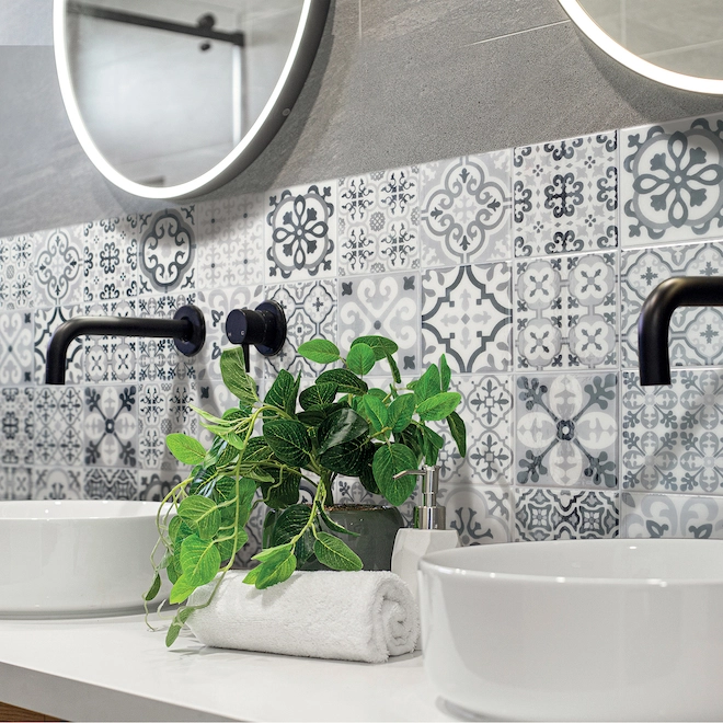 Soyez le premier à laisser votre avis sur “Carreaux à Dosseret Autoadhésifs Style Rétro Bartoli De Smart Tiles, Résine, Noir Et Gris, 9 X 9 Po, Boîte De 4” Annuler la réponse